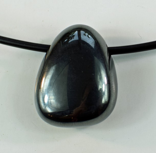 Der Hämatit ist ein nicht magnetisches Eisenoxid und ist eines der wichtigsten Eisenerze. Hämatit kristallisiert in rosettenartigen Kristallen aus. Grosse Kristall-Rosetten sind jedoch sehr selten. Der Hämatit enthält chemisch bis zu 70 % Eisen. Die Grundfarbe des Steines ist blut-, tiefrot, was man jedoch bei der schwarzen, eloxierten Oberfläche nicht sieht. Erst beim Abrieb und gemahlen kommt der intensive Farbton zur Erscheinung. Ein Gramm Hämatitpulver, Schleifpulver färbt ein Eimerwasser blutrot.