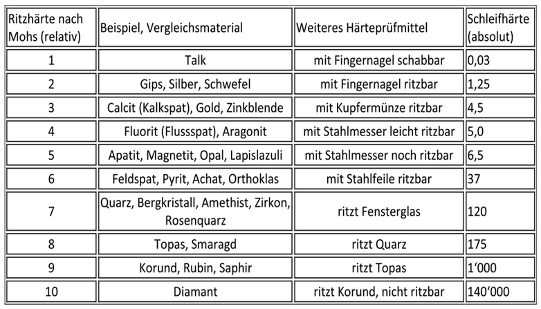 (Mohsche Härteskala) Sie bezieht sich auf die Ritzhärte. Jeder Härtegrad wird